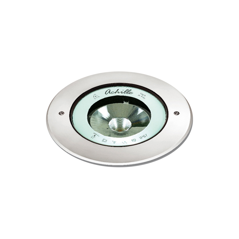 Az Ahille 450 LED egy süllyesztett, a talajjal egy szintbe süllyesztett világítótest, amely kiemeli az építészeti és a természeti adottságokat, valamint bájos légkört teremt, az állítható optika segítségével. Ideális homlokzatok, műemlékek és kertek megvilágításához. Jármű- és gyalogos közlekedési helyek megvilágítására is használható, olyan anyagokból tervezték, melyek megóvják a rozsdásodástól. Magas IP67 besorolással rendelkezik. A süllyesztett ház könnyen rögzíthető a felszerelni kívánt helyre. Felszerelés után a lámpatestet 360 ° -ban lehet forgatni, így a fénysugár megfelelően szabályozható. A csatlakozódoboz a lámpatest alsó részén helyezkedik el. A csatlakozódoboz és a lámpatest teste között egy harmadik kábeltömítés tökéletes vízzárást biztosít. Az optika szimmetrikus, állítható +/- 12 °. Kiegészítőként különféle könnyen cserélhető professzionális optikák állnak rendelkezésre, a különböző sugárzási szögek elérésére.| Megnevezés | Teljesítmény (W) | Lumen érték (lm) | Színhőmérséklet (K) | Súly (kg) | Méret (mm) | Letöltés | |