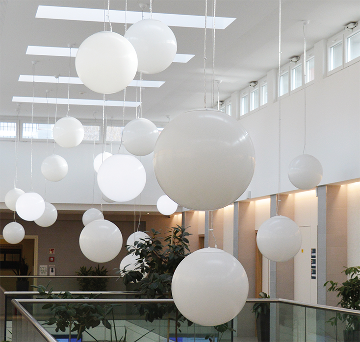 Felfüggesztett gömbökből álló játékos installáció, mely a funkcionalitáson túl körszerűséget tükröz. Egyben jelent modernitást és környezettudatosságot ez a megoldás. Alkalmazott anyagok, technológiák: PMMA, RGBW, LED modul| Megnevezés | Teljesítmény (W) | Átmérő | Lumen érték (lm) | Színvisszaadási index (Ra) | Színhőmérséklet (K) | Letöltés |