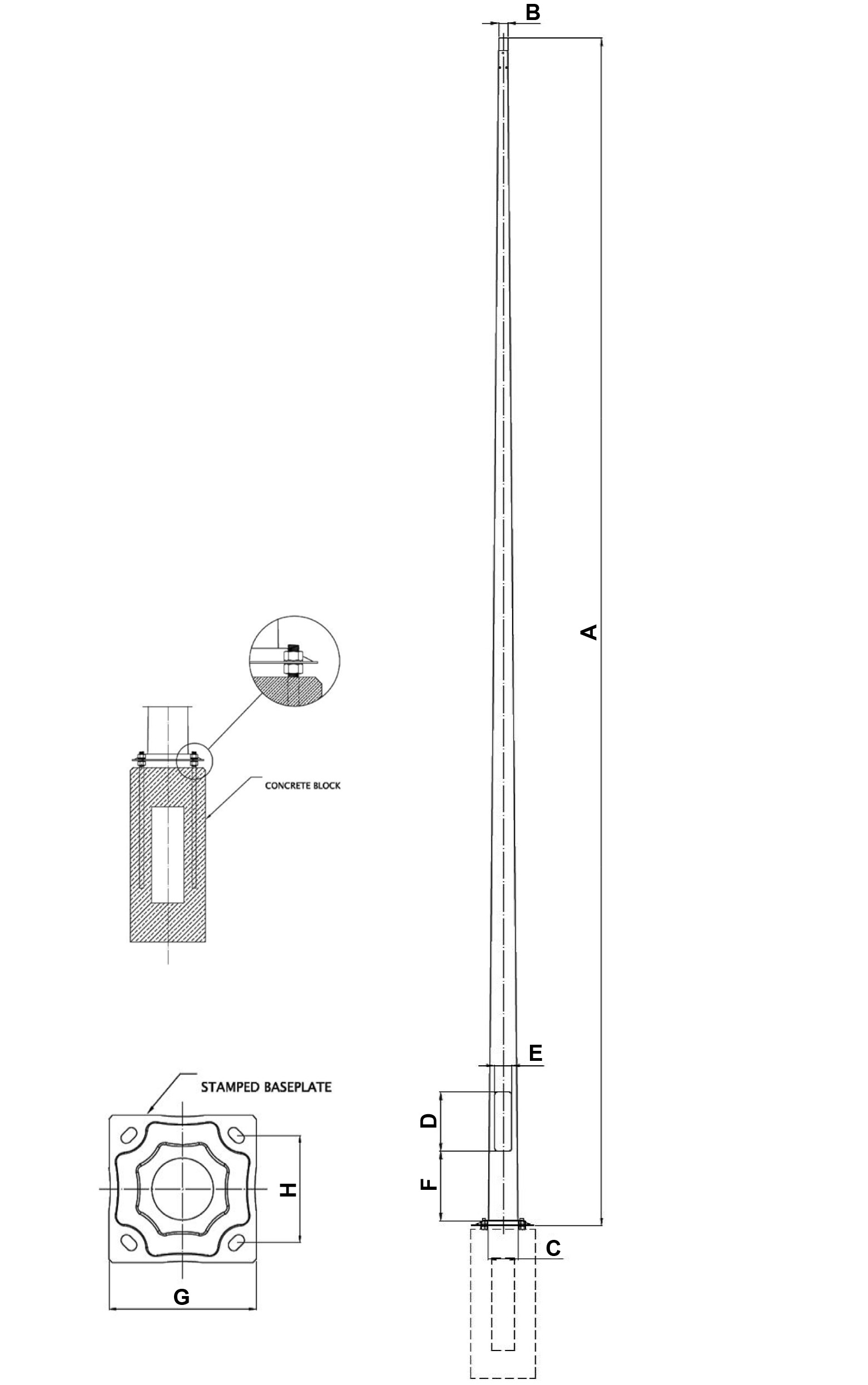 Tűzihorgonyzott acél oszlop (EN ISO 1461) Por valamint hidrodinamikai festés minden RAL vagy AKZO színben| Megnevezés | Magasság (m) | Súly (kg) | Méret (mm) | Letöltés | ||||||||||